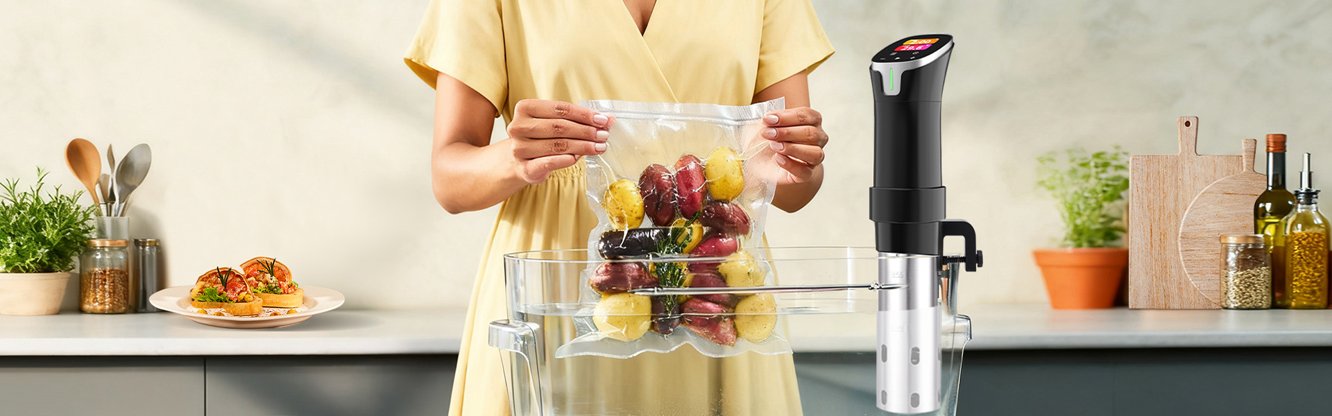 Sous Vide er en tilberedningsmetode som tar temperaturkontroll til det ytterste. Ved å sirkulere vann med jevn varme blir maten jevnt tilberedt fra kant til kjerne. Enten det er biff, fisk eller kyllingbryst, oppnår hver rett perfekt resultat.Forskjellen ligger ofte bare i noen få grader, og presis temperatur er nøkkelen til mørhet og smak. Med Sous Vide trenger du aldri å bekymre deg for overstekt eller tørt kjøtt – hver gang får du resultater på profesjonelt nivå.